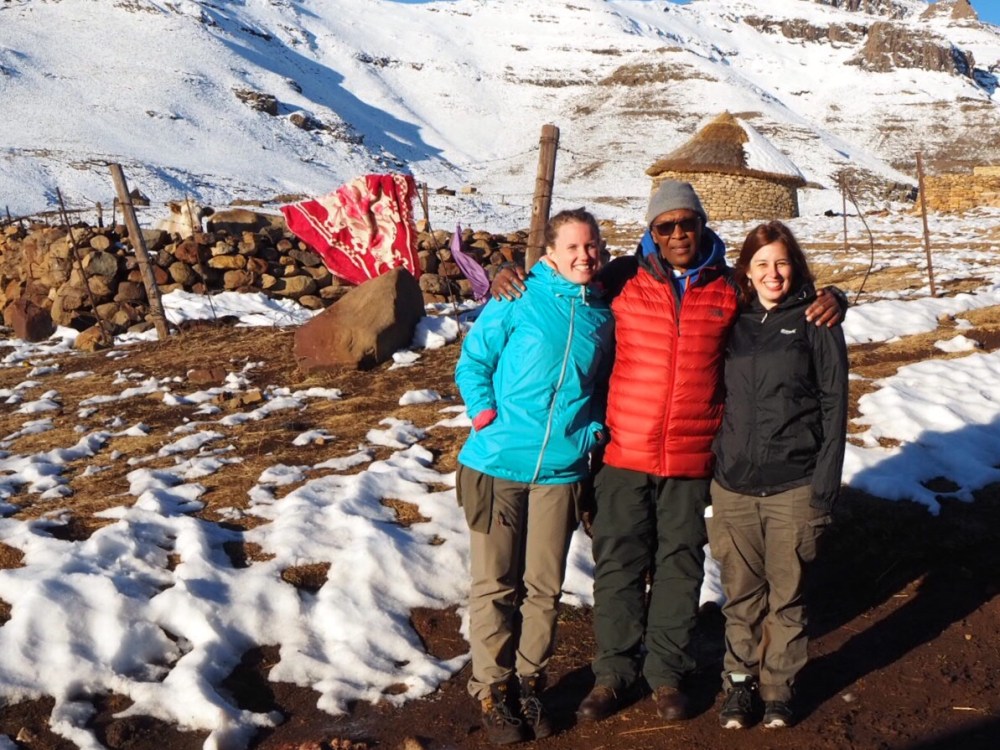Erst nach weiteren zwei Stunden Fahrt wird Thabo klar, dass keine größere Stadt mehr auf unserer Route liegt. Dass wir wirklich in einem traditionellen Dorf übernachten wollen, ohne Strom. „Ein Ausflug in meine Kindheit“, lacht er. Er lässt seinen Koffer in unserem Auto und stiefelt mit uns durch den Schnee den Berg hinauf. Kaum im Dorf angekommen, verabschiedet er sich wieder. „Der Bus kommt morgen früh um fünf Uhr im nächsten Dorf, ich breche lieber auf.“