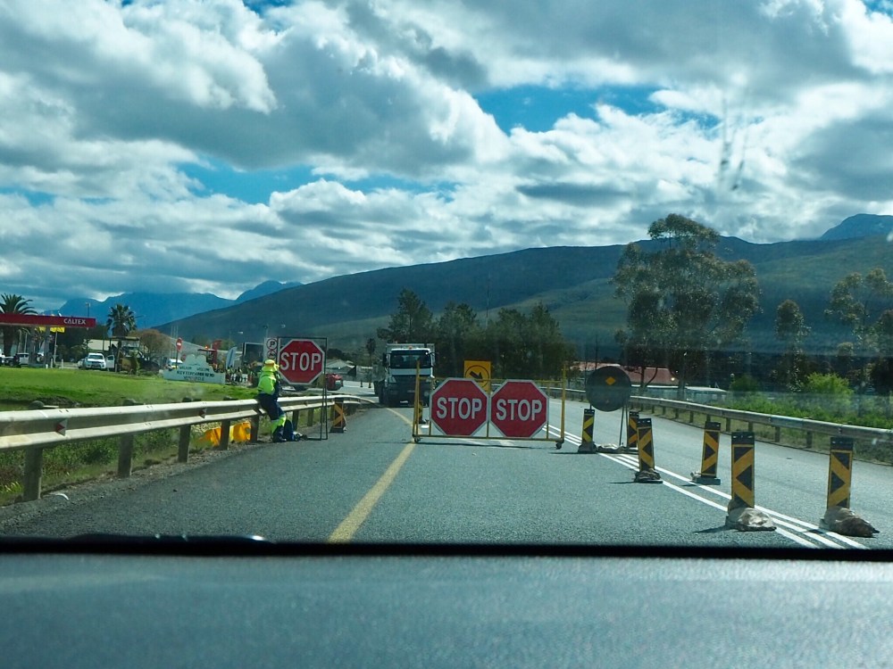 Einziges Hindernis: Die vielen Baustellen. Die erkennt man schon von weitem an den Mitarbeitern in Wanrweste, die für jedes Auto ihre Fahne schwenken und so vor der Baustelle warnen. Oft ist eine Fahrbahn gesperrt, deshalb kann man schon mal einige Minuten vor einer Baustelle warten. Das nutzen fleißige Südafrikaner und verkaufen Lollies, Schokoriegel oder Obst an die Autofahrer.