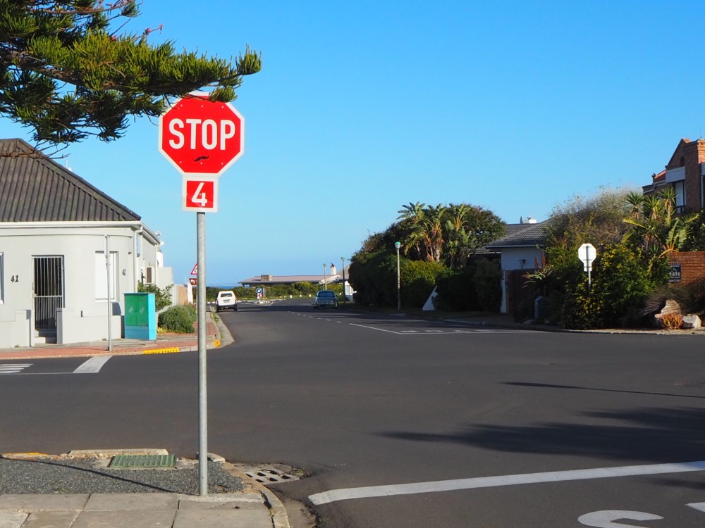 In Südafrika gilt kein links vor rechts! Die meisten Kreuzungen haben hier an allen Seiten ein Stopschild, dass die Autofahrer sehr ernst nehmen. An der Kreuzung dürfen die Autos zuerst wieder anfahren, die auch als erstes angekommen sind. Das funktioniert bemerkenswert gut. Die meisten Autofahrer sind an den Kreuzungen vorsichtig und stimmen sich im Zweifelsfall auch über Handzeichen ab.
