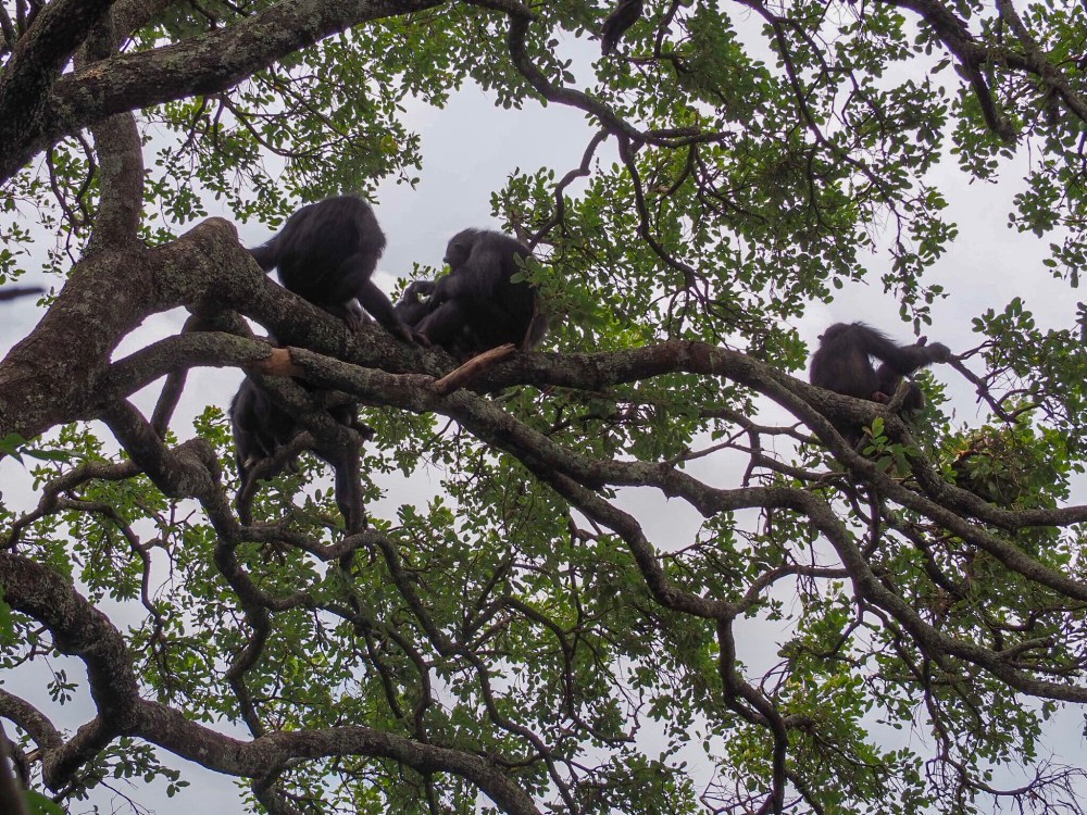 Schimpansen sitzen, liegen, klettern auf jedem Ast, zu viele, um sie zu zählen. Nicht dass ich sie zählen wollte. Ich starre nur auf die Affen, wie sie vor dem Wolkenhimmel herumklettern. Sie blicken lässig auf uns hinunter und sich von unserer Anwesenheit nicht stören.