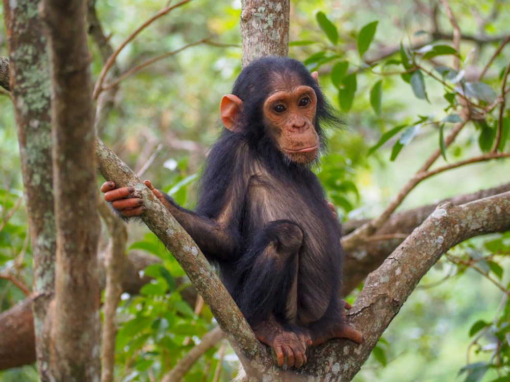 Wir hören die Schimpansen, bevor wir sie sehen. Ihre Uh-Uh-Uhs schallen durch den Regenwald. „Sie sind ganz in der Nähe“, sagt Isaya, unser Guide. Es ist feucht und warm, der Schweiß rinnt mir ins Gesicht. Wir kämpfen uns die letzten Meter den Berg hinauf, unter Lianen und Baumstämmen hindurch. Und blicken in den Baum.