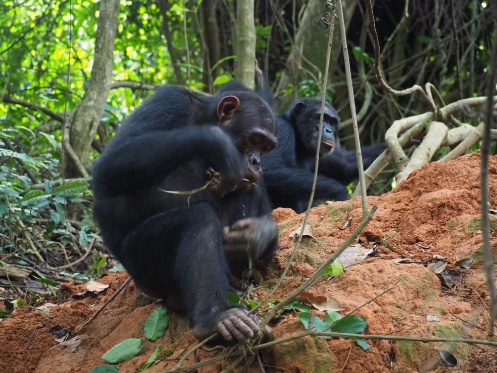 Wir spüren einige Minuten später einen kleinen Teil der Gruppe ein paar hundert Meter weiter unten an einem Termitenhügel wieder auf. Dort sitzt Gimli, und stochert mit einem Stock im Termitenhügel herum. „Sie sind fischen gegangen“, sagt Isaya, unser Guide. „Sie fischen nach Termiten.“ Gimli zieht seinen Stock wieder heraus, knabbert an ihm herum.